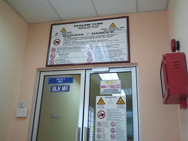 Afiq had to fast for 6 hours before doing MRI and was advised not to wear anything that will attract the magnet, not even 'minyak rambut'. In Afiq's case the thoraxic and cervical parts were scanned. Normally MRI procedures last around 1 hour to 2 hours with the patient lying still inside it and Alhamdulillah his stint in the MRI took less than 1 hour, it would have been less if he had kept still but he moved at one point and the procedure had to be started all over again. Later he told me, he fell asleep while in the MRI. Being a heavy sleeper I am not at all surprised he did that. When asked how he felt inside there, he said.... biaso jah! (nothing to shout about!). Now we are waiting for the MRI results and that will have to wait till the next appointment with the specialist later this month.... another anxious wait.